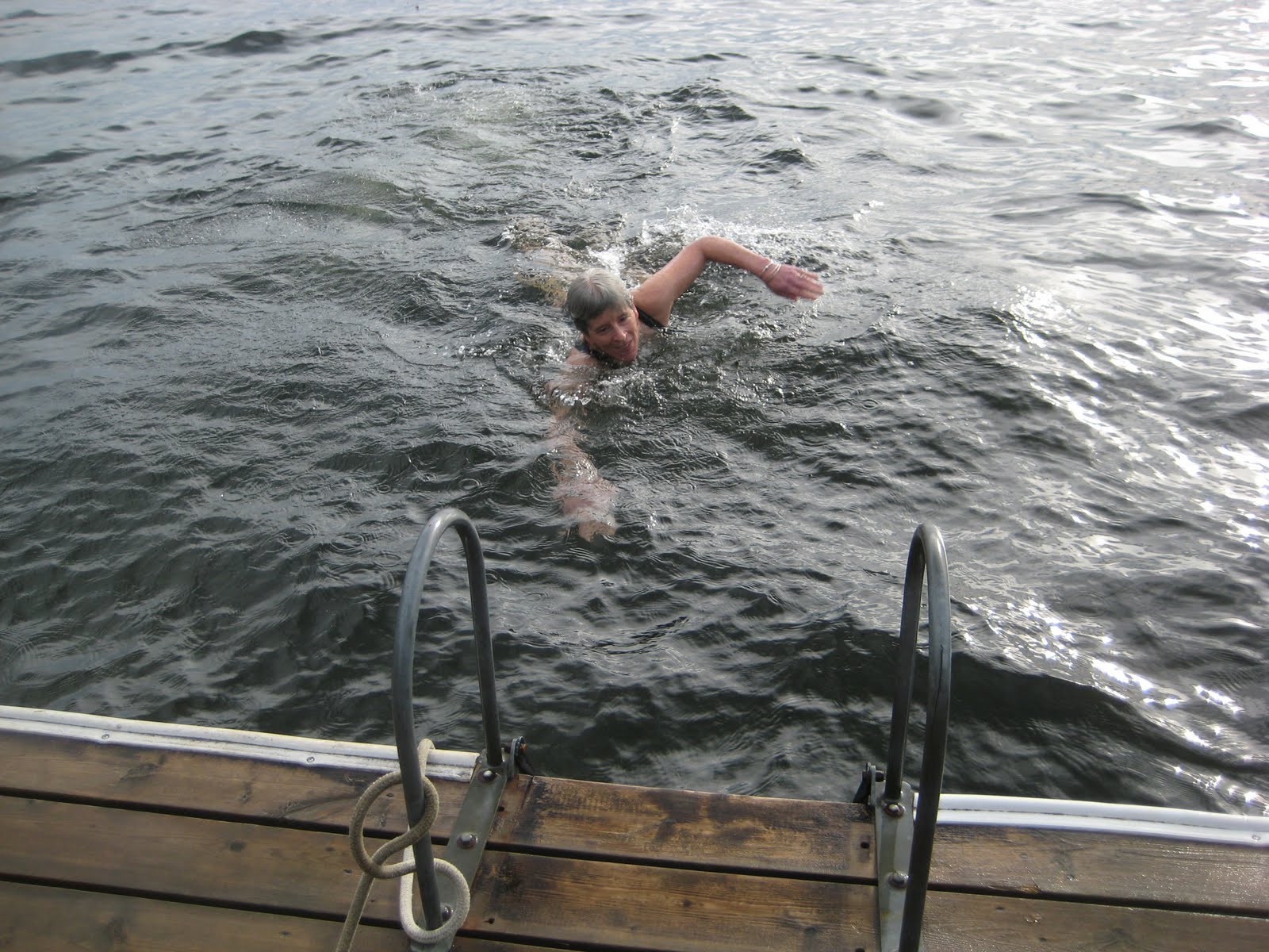 It is now a week later and the lake is already beginning to warm. The weather forecast for the next little while is for the temperatures to rise up into the 20's. If that happens there is a chance that the May Long weekend might be warm enough for a "normal" person to take a quick swim. Usually by mid June the lake is up to a very nice 75F/18C+.